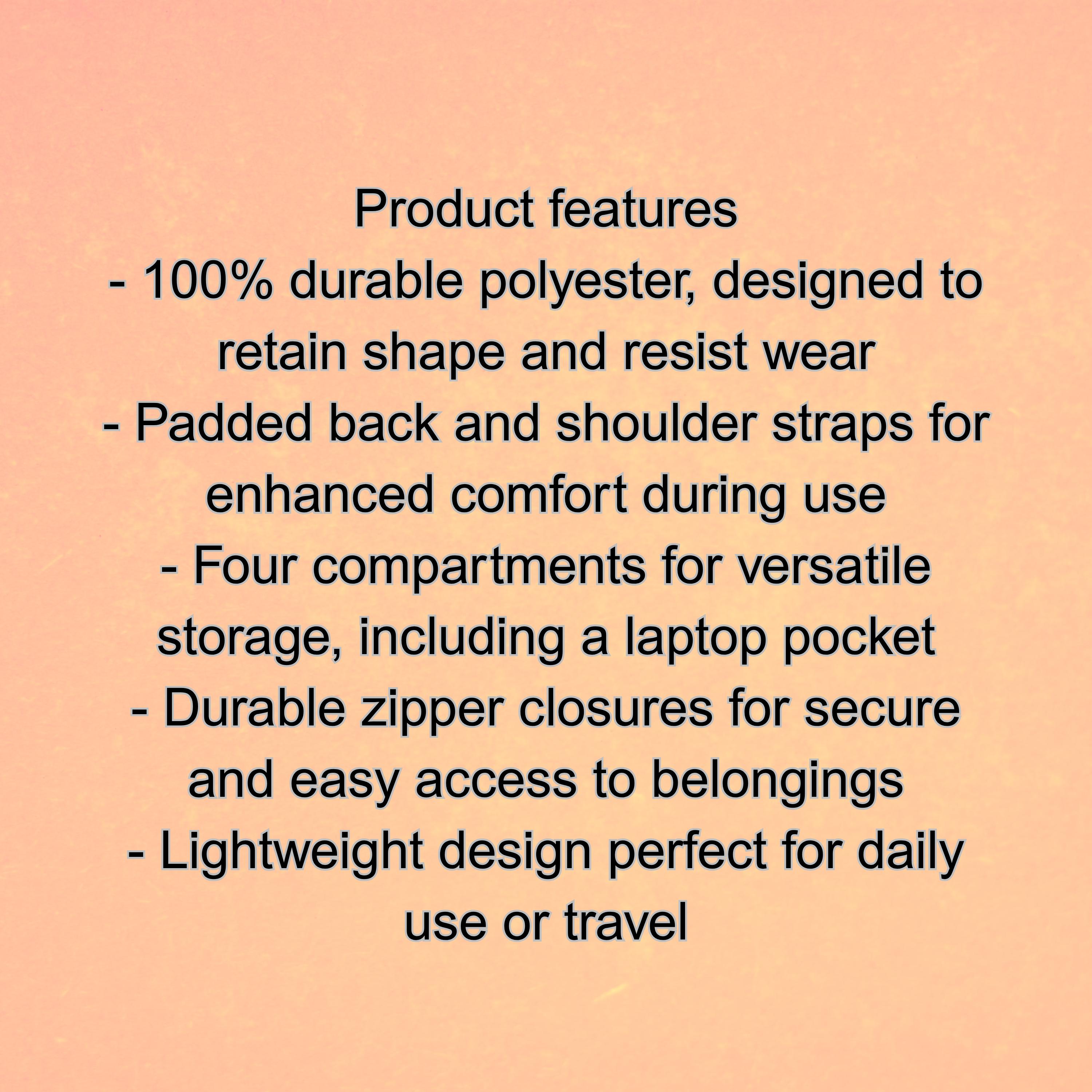 Product features - 100% durable Polyester material for longevity and quick drying - Padded back panel and straps for comfort and breathability - Four compartments including a laptop/tablet holder for organization - Sturdy zipper closures ensure easy access and safe storage - Assembled in the USA with adjustable straps for a personalized fit